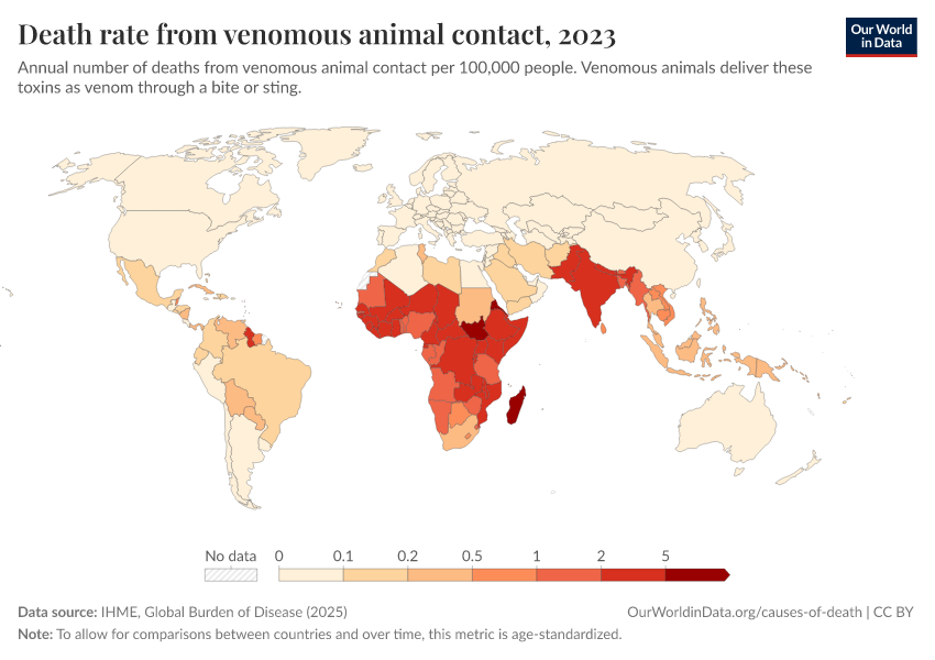 IHME, Global Burden of Disease (2025) – with major processing by Our World in Data. “Death rate from venomous animal contact – IHME” [dataset]. IHME, Global Burden of Disease, “Global Burden of Disease - Deaths” [original data]. Retrieved April 11, 2026 from https://bespoke-viz-urb.owid.pages.dev:8789/20260323-161325/grapher/death-rate-from-venomous-animal.html (archived on March 23, 2026).