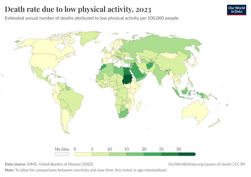 IHME, Global Burden of Disease (2025) – with major processing by Our World in Data. “Death rate due to low physical activity – IHME” [dataset]. IHME, Global Burden of Disease, “Global Burden of Disease - Risk Factors - Deaths” [original data]. Retrieved April 11, 2026 from https://bespoke-viz-urb.owid.pages.dev:8789/20260319-180505/grapher/death-rates-due-to-low-physical-activity.html (archived on March 19, 2026).