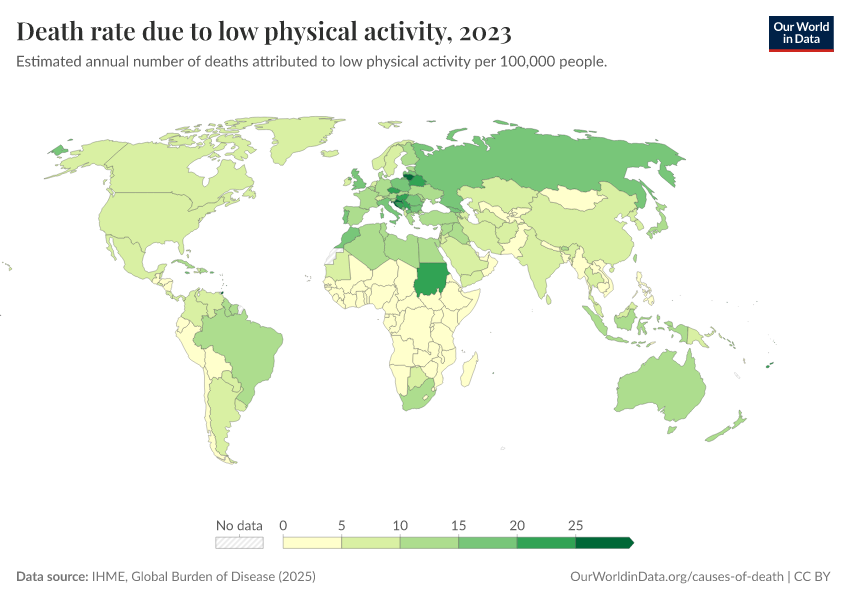 IHME, Global Burden of Disease (2025) – with major processing by Our World in Data. “Death rate due to low physical activity – IHME” [dataset]. IHME, Global Burden of Disease, “Global Burden of Disease - Risk Factors - Deaths” [original data]. Retrieved April 11, 2026 from https://bespoke-viz-urb.owid.pages.dev:8789/20260319-180505/grapher/death-rates-due-to-low-physical-activity-gbd.html (archived on March 19, 2026).