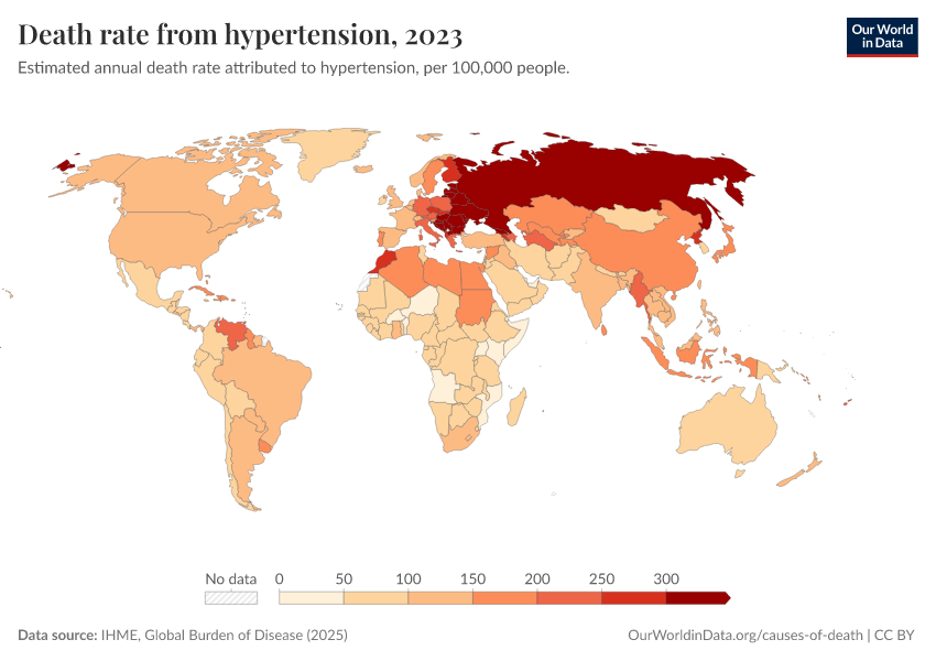 IHME, Global Burden of Disease (2025) – with major processing by Our World in Data. “Death rate from hypertension – IHME” [dataset]. IHME, Global Burden of Disease, “Global Burden of Disease - Risk Factors - Deaths” [original data]. Retrieved April 11, 2026 from https://bespoke-viz-urb.owid.pages.dev:8789/20260319-180505/grapher/death-rates-from-high-blood-pressure-gbd.html (archived on March 19, 2026).