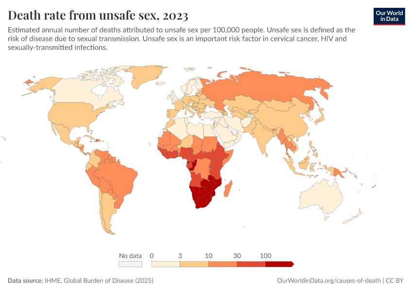 IHME, Global Burden of Disease (2025) – with major processing by Our World in Data. “Death rate from unsafe sex – IHME” [dataset]. IHME, Global Burden of Disease, “Global Burden of Disease - Risk Factors - Deaths” [original data]. Retrieved April 11, 2026 from https://bespoke-viz-urb.owid.pages.dev:8789/20260319-180505/grapher/death-rates-from-unsafe-sex-gbd.html (archived on March 19, 2026).
