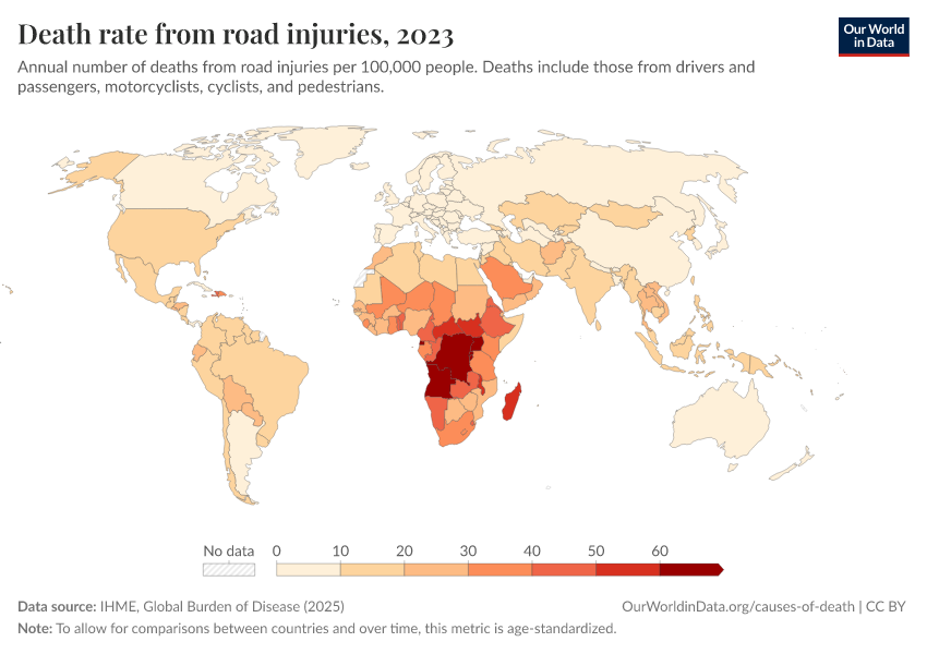 IHME, Global Burden of Disease (2025) – with major processing by Our World in Data. “Death rate from road injuries – IHME” [dataset]. IHME, Global Burden of Disease, “Global Burden of Disease - Deaths” [original data]. Retrieved April 11, 2026 from https://bespoke-viz-urb.owid.pages.dev:8789/20260323-161325/grapher/death-rates-road-incidents.html (archived on March 23, 2026).