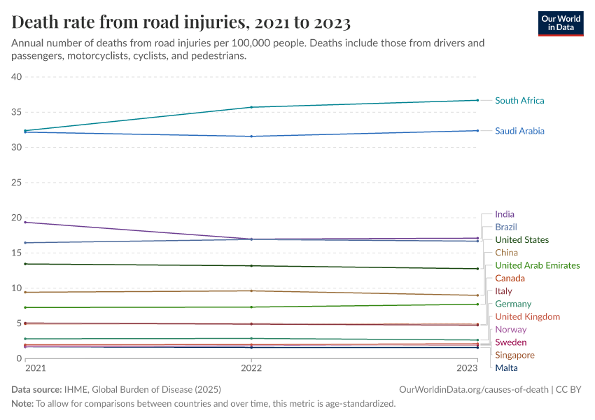 IHME, Global Burden of Disease (2025) – with major processing by Our World in Data. “Death rate from road injuries – IHME” [dataset]. IHME, Global Burden of Disease, “Global Burden of Disease - Deaths” [original data]. Retrieved April 11, 2026 from https://bespoke-viz-urb.owid.pages.dev:8789/20260323-161325/grapher/death-rates-road-incidents.html (archived on March 23, 2026).