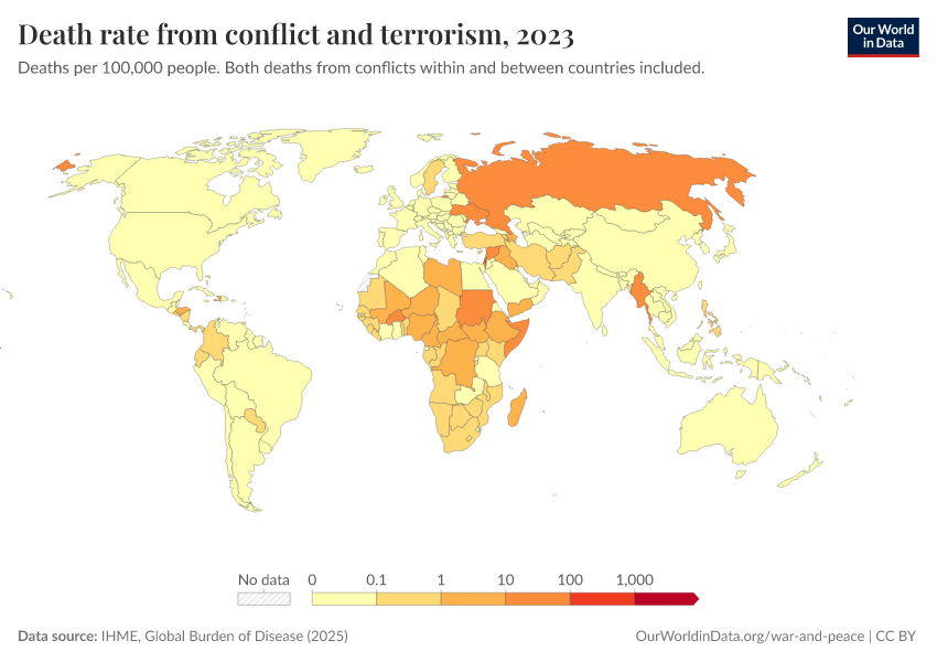 IHME, Global Burden of Disease (2025) – with major processing by Our World in Data. “Death rate from conflict and terrorism – IHME” [dataset]. IHME, Global Burden of Disease, “Global Burden of Disease - Deaths” [original data]. Retrieved April 11, 2026 from https://bespoke-viz-urb.owid.pages.dev:8789/20260323-161325/grapher/deaths-conflict-terrorism-per-100000.html (archived on March 23, 2026).