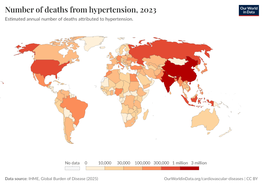 IHME, Global Burden of Disease (2025) – with major processing by Our World in Data. “Number of deaths from hypertension – IHME” [dataset]. IHME, Global Burden of Disease, “Global Burden of Disease - Risk Factors - Deaths” [original data]. Retrieved April 11, 2026 from https://bespoke-viz-urb.owid.pages.dev:8789/20260319-180137/grapher/deaths-due-to-high-blood-pressure.html (archived on March 19, 2026).