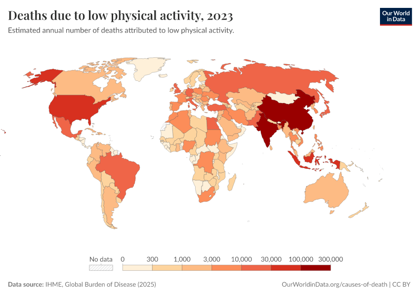 “Data Page: Deaths due to low physical activity”, part of the following publication: Esteban Ortiz-Ospina and Max Roser (2016) - “Global Health”. Data adapted from IHME, Global Burden of Disease. Retrieved from https://bespoke-viz-urb.owid.pages.dev:8789/20260319-180137/grapher/deaths-due-to-low-physical-activity.html [online resource] (archived on March 19, 2026).How to cite this data