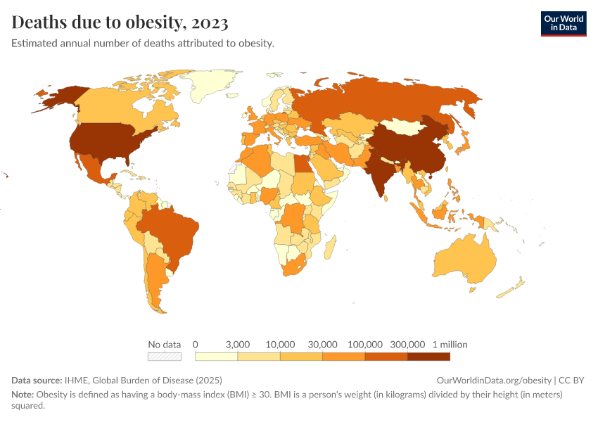 IHME, Global Burden of Disease (2025) – with major processing by Our World in Data. “Deaths due to obesity – IHME” [dataset]. IHME, Global Burden of Disease, “Global Burden of Disease - Risk Factors - Deaths” [original data]. Retrieved April 11, 2026 from https://bespoke-viz-urb.owid.pages.dev:8789/20260319-180137/grapher/deaths-due-to-obesity.html (archived on March 19, 2026).