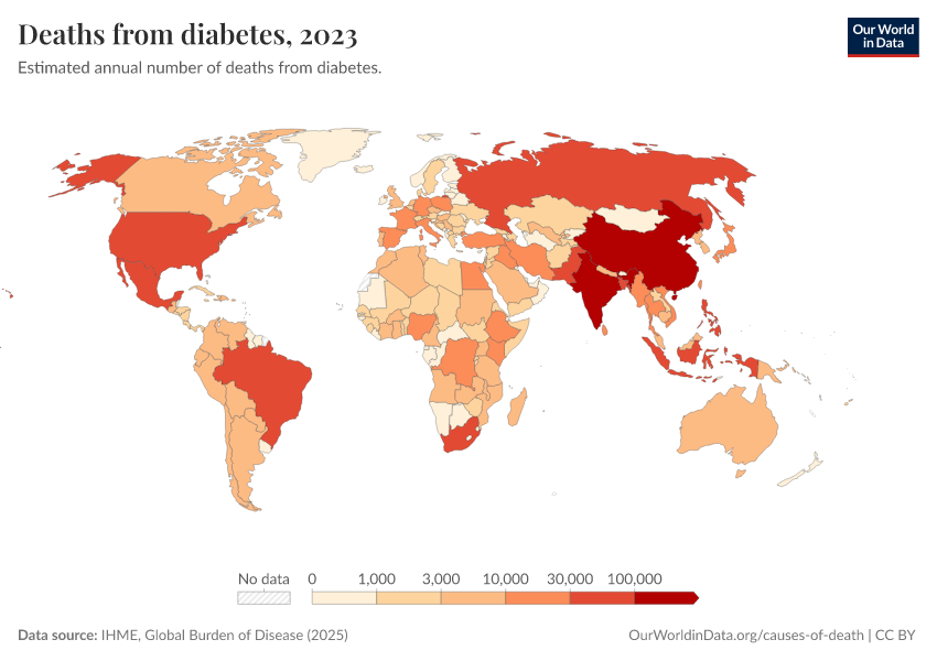 IHME, Global Burden of Disease (2025) – with major processing by Our World in Data. “Deaths from diabetes – IHME” [dataset]. IHME, Global Burden of Disease, “Global Burden of Disease - Deaths” [original data]. Retrieved April 11, 2026 from https://bespoke-viz-urb.owid.pages.dev:8789/20260323-160356/grapher/deaths-from-diabetes.html (archived on March 23, 2026).