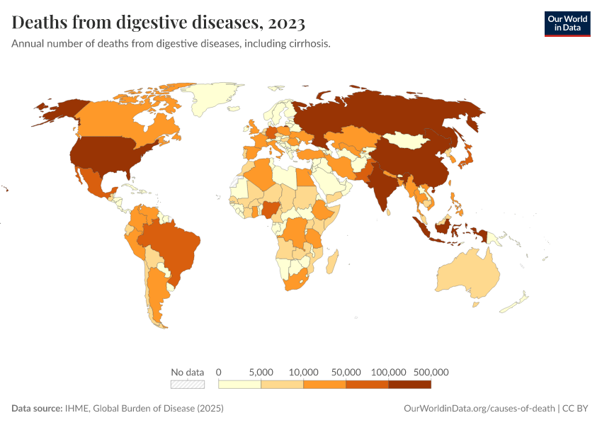 IHME, Global Burden of Disease (2025) – with major processing by Our World in Data. “Deaths from digestive diseases – IHME” [dataset]. IHME, Global Burden of Disease, “Global Burden of Disease - Deaths” [original data]. Retrieved April 11, 2026 from https://bespoke-viz-urb.owid.pages.dev:8789/20260323-160356/grapher/deaths-from-digestive-diseases.html (archived on March 23, 2026).