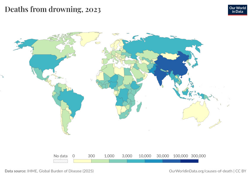 IHME, Global Burden of Disease (2025) – with major processing by Our World in Data. “Deaths from drowning – IHME” [dataset]. IHME, Global Burden of Disease, “Global Burden of Disease - Deaths” [original data]. Retrieved April 11, 2026 from https://bespoke-viz-urb.owid.pages.dev:8789/20260323-160356/grapher/deaths-from-drowning.html (archived on March 23, 2026).