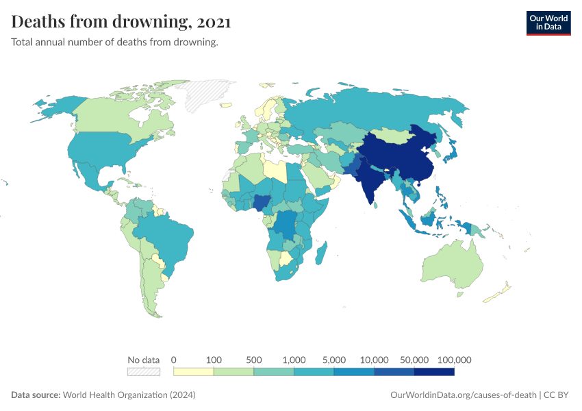 World Health Organization (2024) – with major processing by Our World in Data. “Deaths from drowning” [dataset]. World Health Organization, “Global Health Estimates” [original data]. Retrieved April 11, 2026 from https://bespoke-viz-urb.owid.pages.dev:8789/20260325-171315/grapher/deaths-from-drowning-ghe.html (archived on March 25, 2026).Download