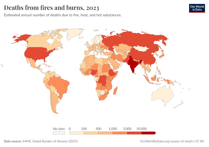 IHME, Global Burden of Disease (2025) – with major processing by Our World in Data. “Deaths from fires and burns – IHME” [dataset]. IHME, Global Burden of Disease, “Global Burden of Disease - Deaths” [original data]. Retrieved April 11, 2026 from https://bespoke-viz-urb.owid.pages.dev:8789/20260323-160356/grapher/deaths-from-fires-and-burns.html (archived on March 23, 2026).