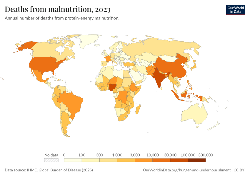 IHME, Global Burden of Disease (2025) – with major processing by Our World in Data. “Deaths from malnutrition – IHME” [dataset]. IHME, Global Burden of Disease, “Global Burden of Disease - Deaths” [original data]. Retrieved April 11, 2026 from https://bespoke-viz-urb.owid.pages.dev:8789/20260323-160356/grapher/deaths-from-malnutrition.html (archived on March 23, 2026).
