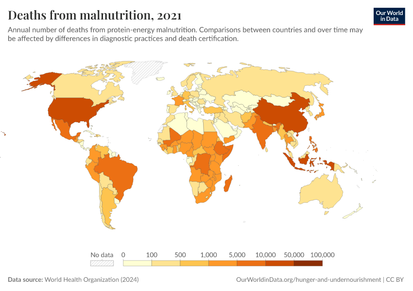 World Health Organization (2024) – with major processing by Our World in Data. “Deaths from malnutrition” [dataset]. World Health Organization, “Global Health Estimates” [original data]. Retrieved April 11, 2026 from https://bespoke-viz-urb.owid.pages.dev:8789/20260330-100833/grapher/deaths-from-malnutrition-ghe.html (archived on March 30, 2026).Download