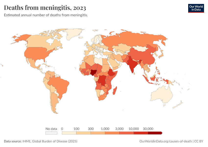 “Data Page: Deaths from meningitis”, part of the following publication: Esteban Ortiz-Ospina and Max Roser (2016) - “Global Health”. Data adapted from IHME, Global Burden of Disease. Retrieved from https://bespoke-viz-urb.owid.pages.dev:8789/20260323-160356/grapher/deaths-from-meningitis.html [online resource] (archived on March 23, 2026).How to cite this data