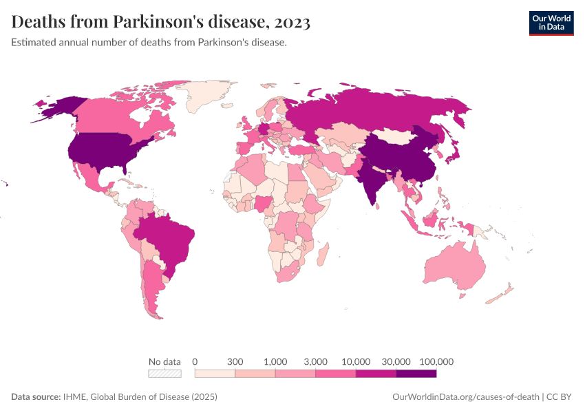 IHME, Global Burden of Disease (2025) – with major processing by Our World in Data. “Deaths from Parkinson's disease – IHME” [dataset]. IHME, Global Burden of Disease, “Global Burden of Disease - Deaths” [original data]. Retrieved April 11, 2026 from https://bespoke-viz-urb.owid.pages.dev:8789/20260323-160356/grapher/deaths-from-parkinsons-disease.html (archived on March 23, 2026).