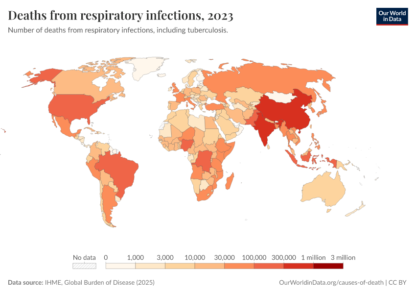 IHME, Global Burden of Disease (2025) – with major processing by Our World in Data. “Deaths from respiratory infections – IHME” [dataset]. IHME, Global Burden of Disease, “Global Burden of Disease - Deaths” [original data]. Retrieved April 11, 2026 from https://bespoke-viz-urb.owid.pages.dev:8789/20260323-160356/grapher/deaths-from-respiratory-infections.html (archived on March 23, 2026).