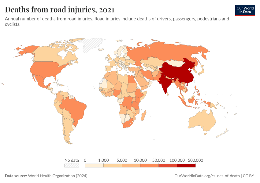“Data Page: Deaths from road injuries”, part of the following publication: Esteban Ortiz-Ospina and Max Roser (2016) - “Global Health”. Data adapted from World Health Organization. Retrieved from https://bespoke-viz-urb.owid.pages.dev:8789/20260325-171315/grapher/deaths-from-road-injuries.html [online resource] (archived on March 25, 2026).How to cite this data