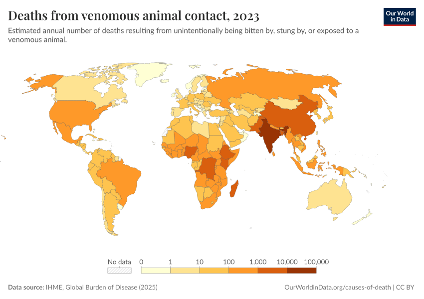 IHME, Global Burden of Disease (2025) – with major processing by Our World in Data. “Deaths from venomous animal contact – IHME” [dataset]. IHME, Global Burden of Disease, “Global Burden of Disease - Deaths” [original data]. Retrieved April 11, 2026 from https://bespoke-viz-urb.owid.pages.dev:8789/20260323-160356/grapher/deaths-from-venomous-animal-contact.html (archived on March 23, 2026).