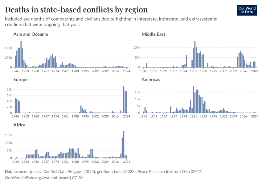 “Data Page: Deaths in state-based conflicts by region”, part of the following publication: Bastian Herre, Lucas Rodés-Guirao, and Max Roser (2024) - “War and Peace”. Data adapted from Uppsala Conflict Data Program, geoBoundaries, Peace Research Institute Oslo. Retrieved from https://bespoke-viz-urb.owid.pages.dev:8789/20260304-094028/grapher/deaths-in-state-based-conflicts-by-region.html [online resource] (archived on March 4, 2026).How to cite this data
