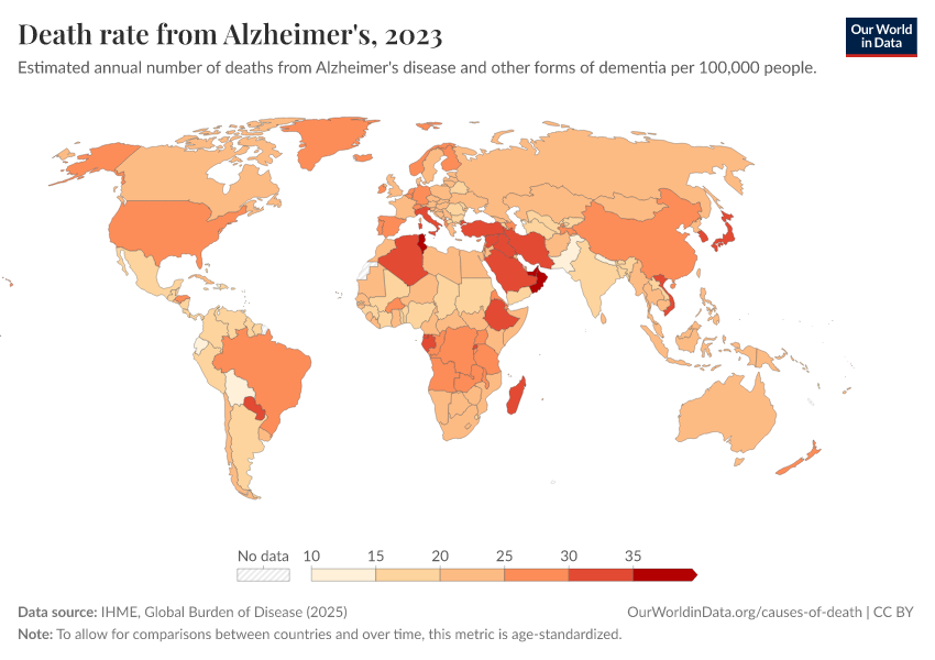 IHME, Global Burden of Disease (2025) – with major processing by Our World in Data. “Death rate from Alzheimer's – IHME” [dataset]. IHME, Global Burden of Disease, “Global Burden of Disease - Deaths” [original data]. Retrieved April 11, 2026 from https://bespoke-viz-urb.owid.pages.dev:8789/20260323-161325/grapher/dementia-death-rates.html (archived on March 23, 2026).