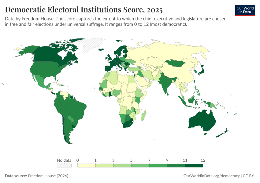 Freedom House (2026) – processed by Our World in Data. “Democratic Electoral Institutions Score” [dataset]. Freedom House, “Freedom in the World” [original data]. Retrieved April 11, 2026 from https://bespoke-viz-urb.owid.pages.dev:8789/20260323-201304/grapher/democratic-electoral-institutions-fh.html (archived on March 23, 2026).Download