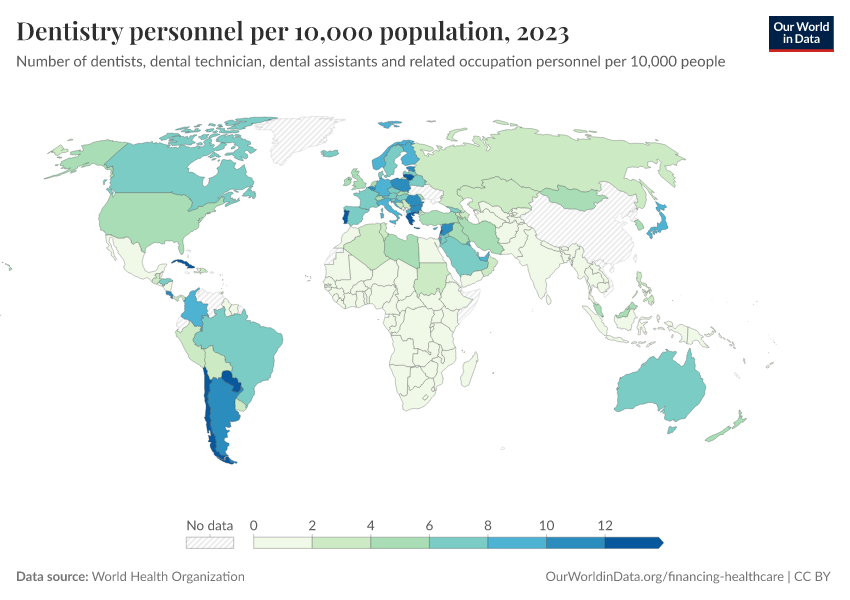 “Data Page: Dentistry personnel per 10,000 population”. Our World in Data (2026). Data adapted from World Health Organization. Retrieved from https://bespoke-viz-urb.owid.pages.dev:8789/20260317-181724/grapher/dentistry-personnel-per-1000.html [online resource] (archived on March 17, 2026).How to cite this data