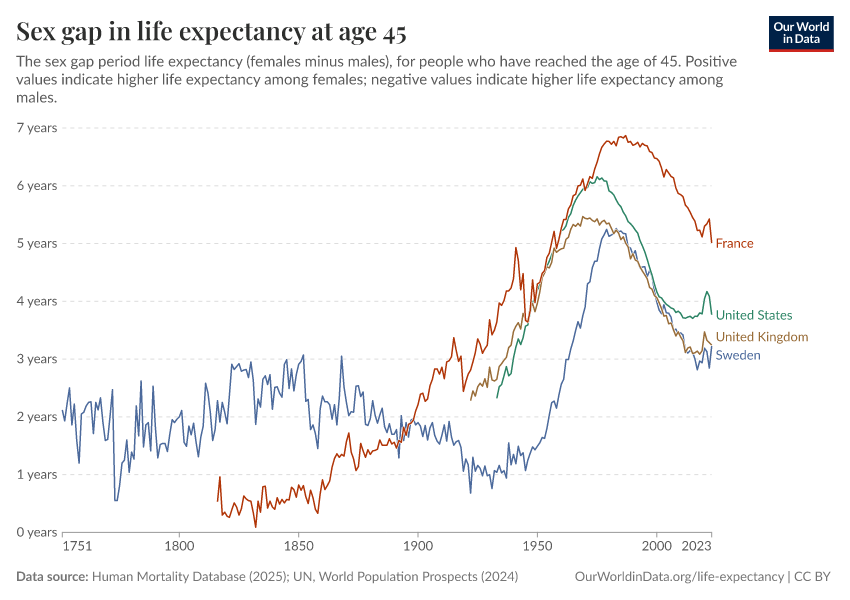 “Data Page: Life expectancy at 45”, part of the following publication: Saloni Dattani, Lucas Rodés-Guirao, Hannah Ritchie, Esteban Ortiz-Ospina, and Max Roser (2023) - “Life Expectancy”. Data adapted from Human Mortality Database, United Nations. Retrieved from https://bespoke-viz-urb.owid.pages.dev:8789/20260304-094028/grapher/difference-in-female-and-male-life-expectancy-at-age-45.html [online resource] (archived on March 4, 2026).How to cite this data