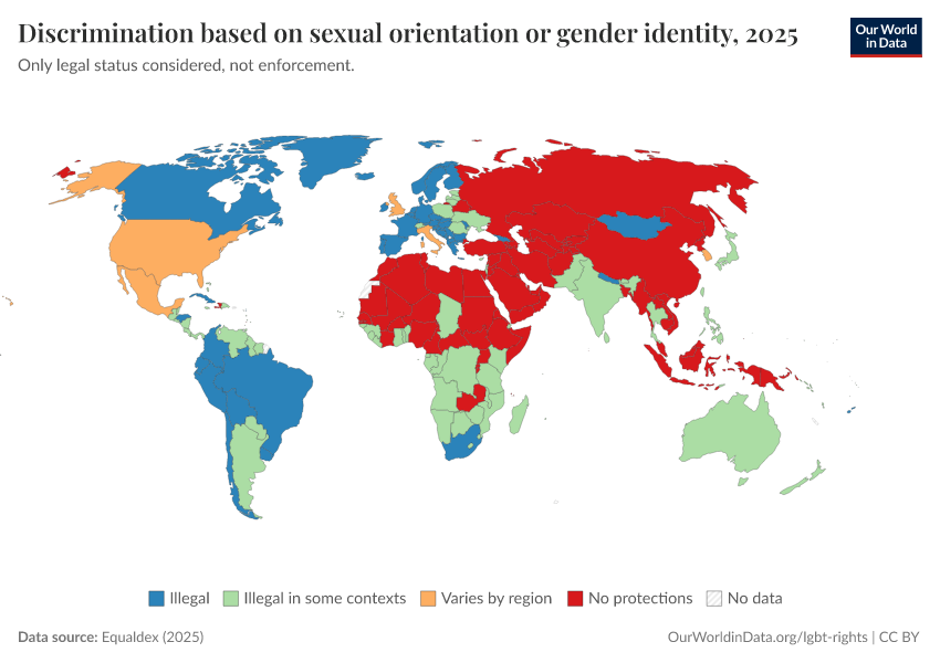 “Data Page: Discrimination based on sexual orientation or gender identity”, part of the following publication: Bastian Herre and Pablo Arriagada (2023) - “LGBT+ Rights”. Data adapted from Equaldex. Retrieved from https://bespoke-viz-urb.owid.pages.dev:8789/20260304-094028/grapher/discrimination-lgbt-equaldex.html [online resource] (archived on March 4, 2026).How to cite this data