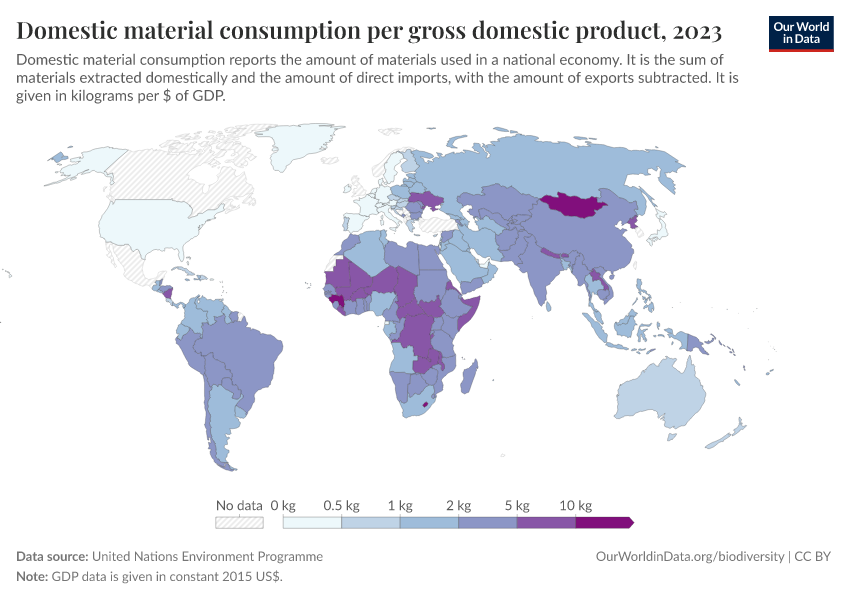 United Nations Environment Programme – processed by Our World in Data. “Domestic material consumption per gross domestic product” [dataset]. United Nations Environment Programme, “WESR / Global Material Flows Database” [original data]. Retrieved April 11, 2026 from https://bespoke-viz-urb.owid.pages.dev:8789/20260304-094028/grapher/domestic-material-consumption-per-unit-of-gdp.html (archived on March 4, 2026).Download