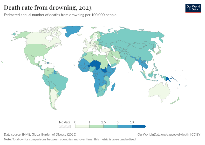 IHME, Global Burden of Disease (2025) – with major processing by Our World in Data. “Death rate from drowning – IHME” [dataset]. IHME, Global Burden of Disease, “Global Burden of Disease - Deaths” [original data]. Retrieved April 11, 2026 from https://bespoke-viz-urb.owid.pages.dev:8789/20260323-161325/grapher/drowning-death-rates.html (archived on March 23, 2026).