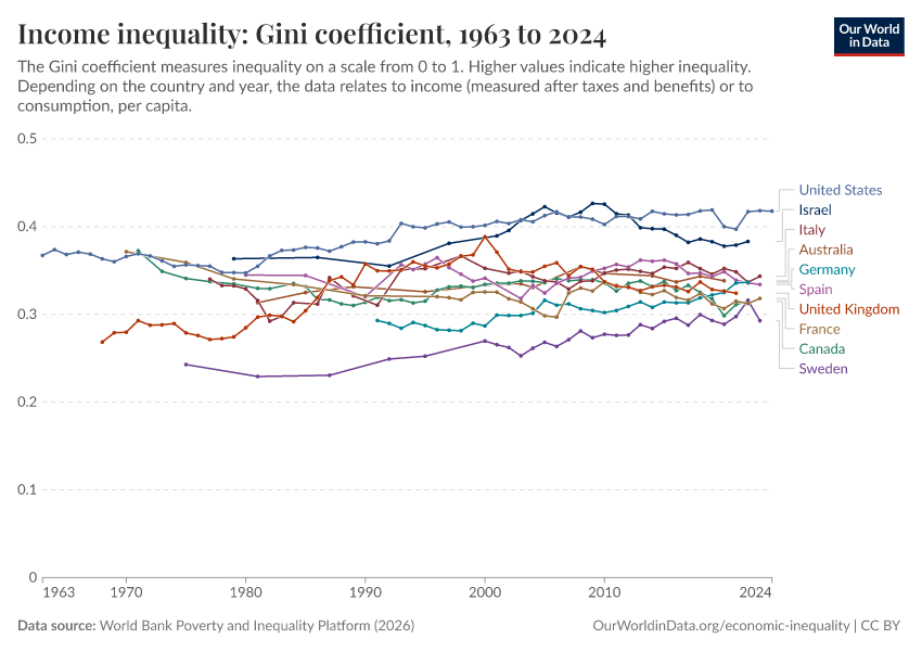 World Bank Poverty and Inequality Platform (2025) – with major processing by Our World in Data. “Income inequality: Gini coefficient – World Bank” [dataset]. World Bank Poverty and Inequality Platform, “World Bank Poverty and Inequality Platform (PIP) 20250930_2021, 20250930_2017” [original data]. Retrieved April 11, 2026 from https://bespoke-viz-urb.owid.pages.dev:8789/20260325-171315/grapher/economic-inequality-gini-index.html (archived on March 25, 2026).Download