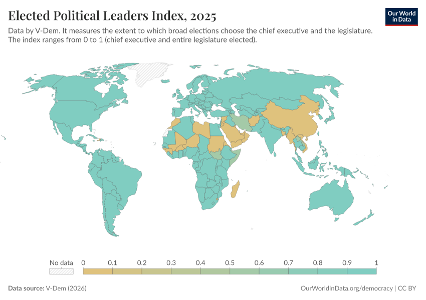 V-Dem (2026) – processed by Our World in Data. “Elected officials index” [dataset]. V-Dem, “Democracy report v16” [original data]. Retrieved April 11, 2026 from https://bespoke-viz-urb.owid.pages.dev:8789/20260325-171315/grapher/elected-political-leaders-index.html (archived on March 25, 2026).Download