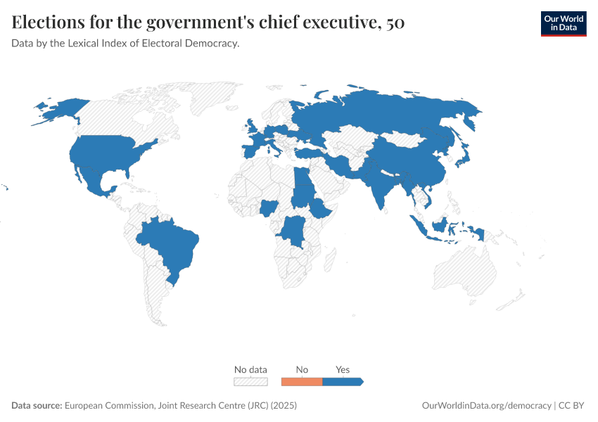 Skaaning et al. (2025) – processed by Our World in Data. “Elections for the government's chief executive” [dataset]. Skaaning et al., “Lexical Index of Electoral Democracy (LIED) v6.8” [original data]. Retrieved April 11, 2026 from https://bespoke-viz-urb.owid.pages.dev:8789/20260318-101336/grapher/elections-for-the-governments-chief-executive.html (archived on March 18, 2026).Download