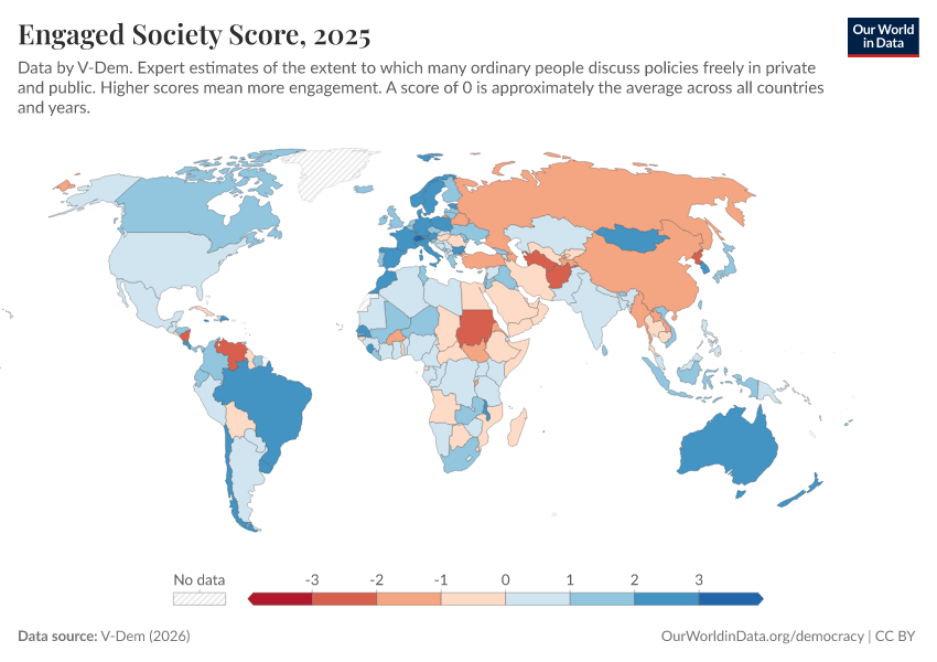 “Data Page: Engaged society”, part of the following publication: Bastian Herre, Lucas Rodés-Guirao, and Esteban Ortiz-Ospina (2013) - “Democracy”. Data adapted from V-Dem. Retrieved from https://bespoke-viz-urb.owid.pages.dev:8789/20260318-112846/grapher/engaged-society-score.html [online resource] (archived on March 18, 2026).How to cite this data