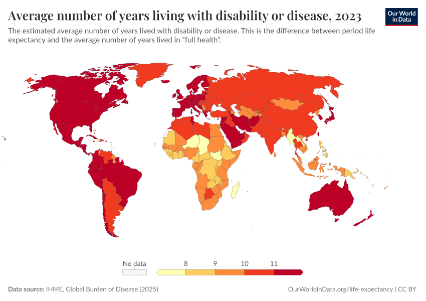 “Data Page: Average number of years living with disability or disease”, part of the following publication: Saloni Dattani, Lucas Rodés-Guirao, Hannah Ritchie, Esteban Ortiz-Ospina, and Max Roser (2023) - “Life Expectancy”. Data adapted from IHME, Global Burden of Disease. Retrieved from https://bespoke-viz-urb.owid.pages.dev:8789/20260319-175416/grapher/expected-years-of-living-with-disability-or-disease-burden.html [online resource] (archived on March 19, 2026).How to cite this data