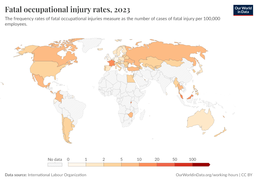 “Data Page: Fatal occupational injury rates”. Our World in Data (2026). Data adapted from International Labour Organization. Retrieved from https://bespoke-viz-urb.owid.pages.dev:8789/20260304-094028/grapher/fatal-occupational-injuries-among-employees.html [online resource] (archived on March 4, 2026).How to cite this data