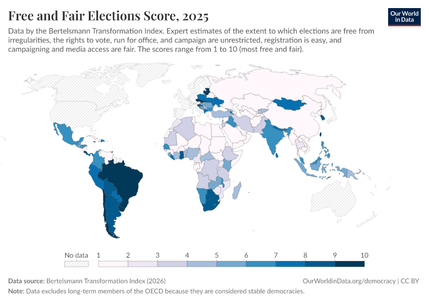Bertelsmann Transformation Index (2026) – processed by Our World in Data. “Free and Fair Elections Score” [dataset]. Bertelsmann Transformation Index, “Bertelsmann Transformation Index, Scores” [original data]. Retrieved April 11, 2026 from https://bespoke-viz-urb.owid.pages.dev:8789/20260327-184752/grapher/free-fair-elections-bti.html (archived on March 27, 2026).Download
