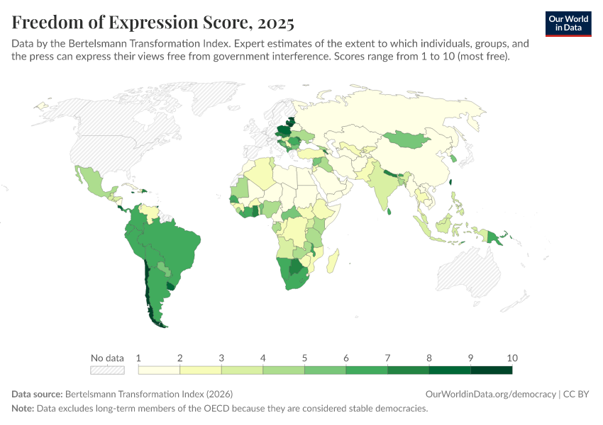“Data Page: Freedom of Expression Score”, part of the following publication: Bastian Herre, Lucas Rodés-Guirao, and Esteban Ortiz-Ospina (2013) - “Democracy”. Data adapted from Bertelsmann Transformation Index. Retrieved from https://bespoke-viz-urb.owid.pages.dev:8789/20260327-184752/grapher/freedom-of-expression-score-bti.html [online resource] (archived on March 27, 2026).How to cite this data