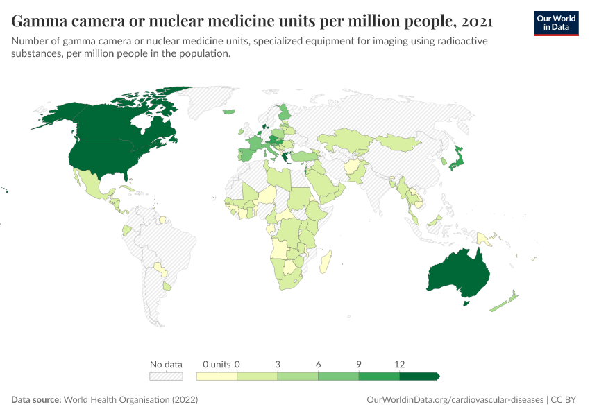 “Data Page: Gamma camera or nuclear medicine units per million people”, part of the following publication: Saloni Dattani, Veronika Samborska, Hannah Ritchie, and Max Roser (2023) - “Cardiovascular Diseases”. Data adapted from World Health Organisation. Retrieved from https://bespoke-viz-urb.owid.pages.dev:8789/20260304-094028/grapher/gamma-camera-or-nuclear-medicine-availability.html [online resource] (archived on March 4, 2026).How to cite this data