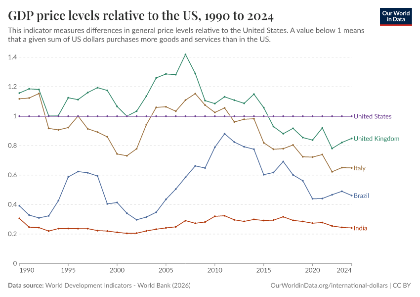 World Development Indicators - World Bank (2026) – processed by Our World in Data. “GDP price levels relative to the US – World Bank” [dataset]. World Development Indicators - World Bank, “World Development Indicators 125” [original data]. Retrieved April 11, 2026 from https://bespoke-viz-urb.owid.pages.dev:8789/20260304-094028/grapher/gdp-price-levels-relative-to-the-us.html (archived on March 4, 2026).Download