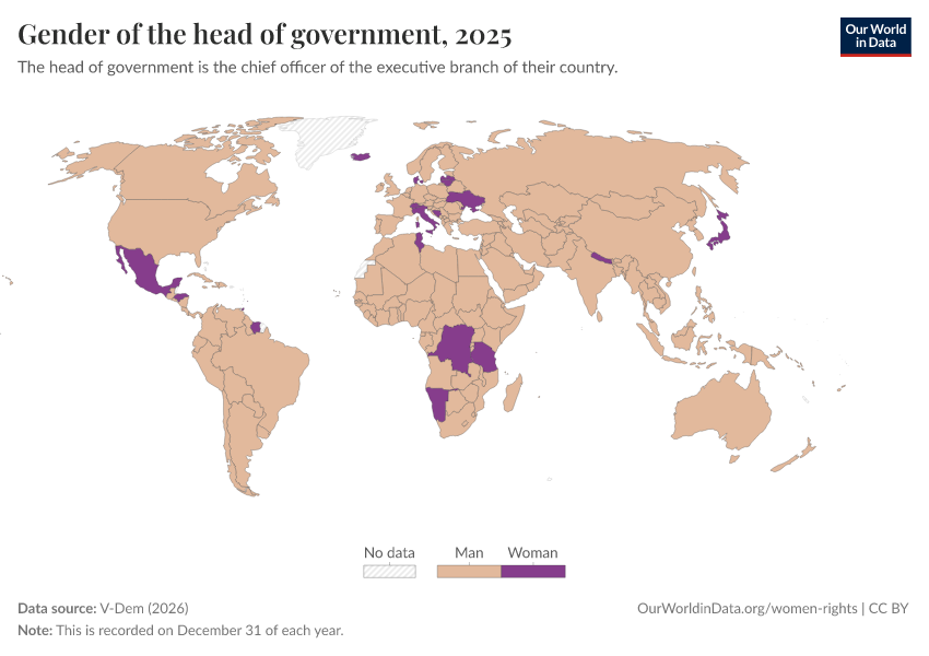 V-Dem (2026) – processed by Our World in Data. “Gender of the head of government” [dataset]. V-Dem, “Democracy report v16” [original data]. Retrieved April 11, 2026 from https://bespoke-viz-urb.owid.pages.dev:8789/20260318-112846/grapher/gender-of-the-head-of-government.html (archived on March 18, 2026).Download