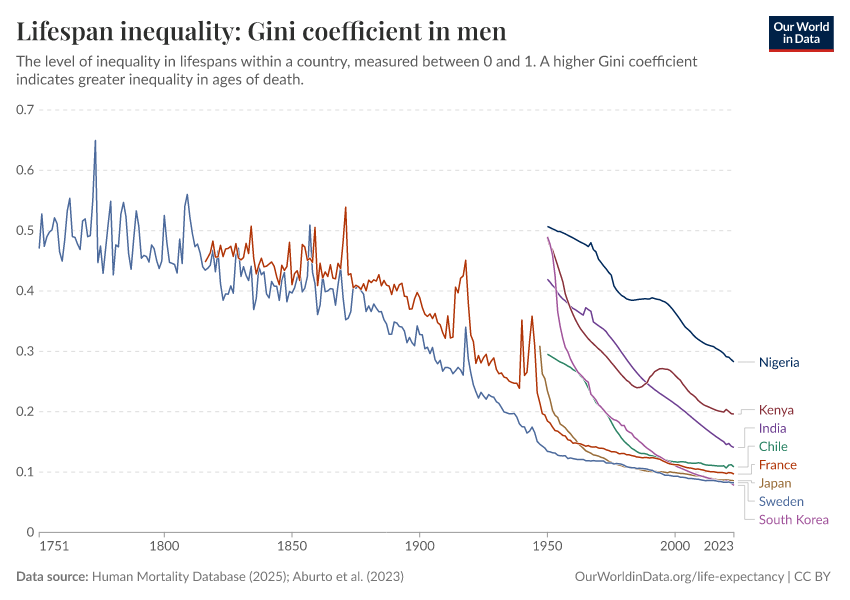 “Data Page: Lifespan inequality: Gini coefficient in men”, part of the following publication: Saloni Dattani, Lucas Rodés-Guirao, Hannah Ritchie, Esteban Ortiz-Ospina, and Max Roser (2023) - “Life Expectancy”. Data adapted from Human Mortality Database, United Nations. Retrieved from https://bespoke-viz-urb.owid.pages.dev:8789/20260304-094028/grapher/gini-coefficient-of-lifespan-inequality-in-males.html [online resource] (archived on March 4, 2026).How to cite this data