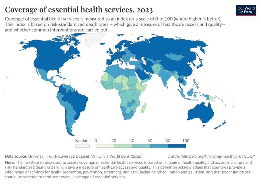 “Data Page: Coverage of essential health services”. Our World in Data (2026). Data adapted from Universal Health Coverage Dataset, WHO, via World Bank. Retrieved from https://bespoke-viz-urb.owid.pages.dev:8789/20260304-094028/grapher/healthcare-access-quality-un.html [online resource] (archived on March 4, 2026).How to cite this data