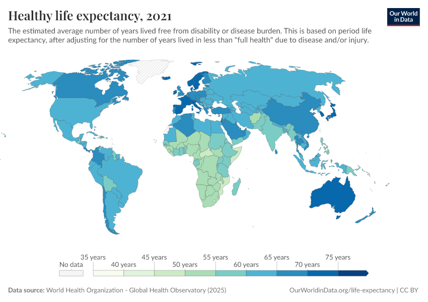 “Data Page: Healthy life expectancy”. Our World in Data (2026). Data adapted from World Health Organization. Retrieved from https://bespoke-viz-urb.owid.pages.dev:8789/20260304-094028/grapher/healthy-life-expectancy-at-birth.html [online resource] (archived on March 4, 2026).How to cite this data