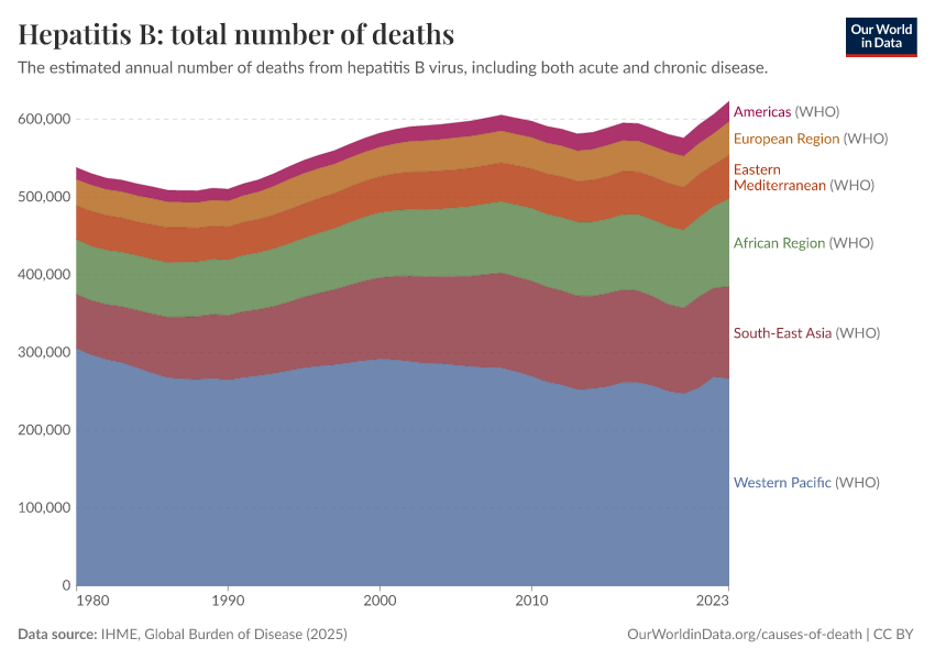 IHME, Global Burden of Disease (2025) – with major processing by Our World in Data. “Hepatitis B: total number of deaths – IHME” [dataset]. IHME, Global Burden of Disease, “Global Burden of Disease - Deaths” [original data]. Retrieved April 11, 2026 from https://bespoke-viz-urb.owid.pages.dev:8789/20260323-160356/grapher/hepatitis-b-number-of-deaths.html (archived on March 23, 2026).