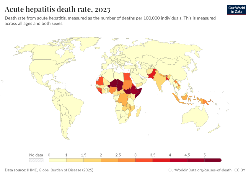 “Data Page: Acute hepatitis death rate”, part of the following publication: Esteban Ortiz-Ospina and Max Roser (2016) - “Global Health”. Data adapted from IHME, Global Burden of Disease. Retrieved from https://bespoke-viz-urb.owid.pages.dev:8789/20260323-161325/grapher/hepatitis-death-rate.html [online resource] (archived on March 23, 2026).How to cite this data