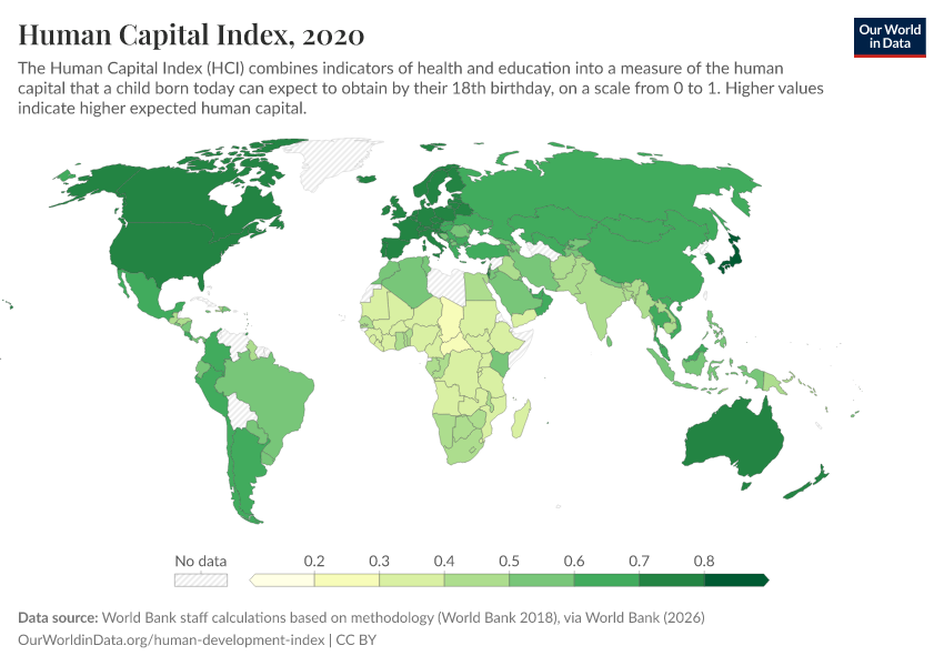 “Data Page: Human Capital Index”. Our World in Data (2026). Data adapted from World Bank staff calculations based on methodology (World Bank 2018), via World Bank. Retrieved from https://bespoke-viz-urb.owid.pages.dev:8789/20260325-171315/grapher/human-capital-index-in-2018.html [online resource] (archived on March 25, 2026).How to cite this data