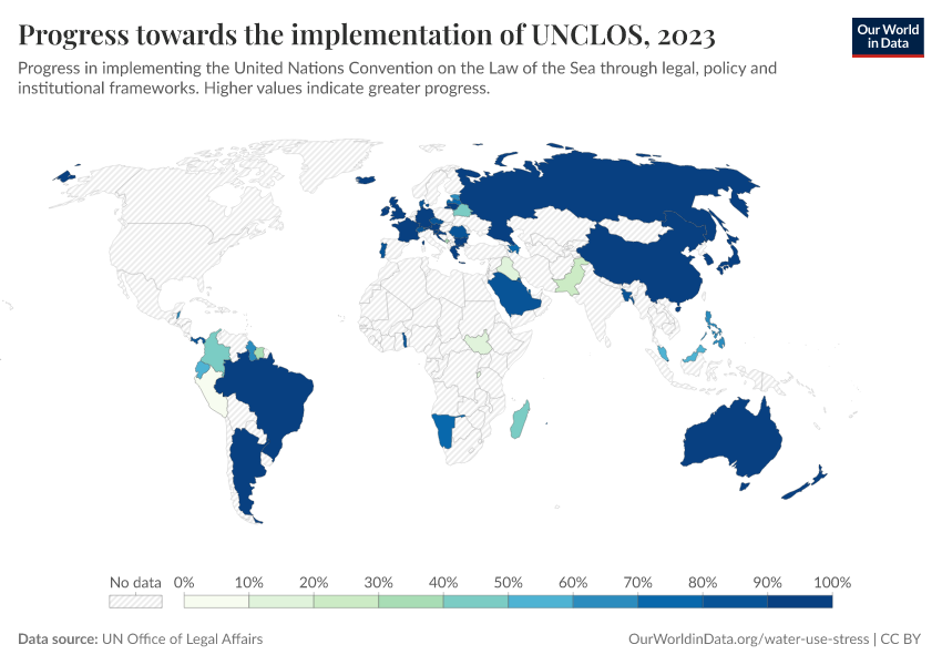 “Data Page: Progress towards the implementation of UNCLOS”. Our World in Data (2026). Data adapted from UN Office of Legal Affairs. Retrieved from https://bespoke-viz-urb.owid.pages.dev:8789/20260304-094028/grapher/implementation-of-unclos.html [online resource] (archived on March 4, 2026).How to cite this data