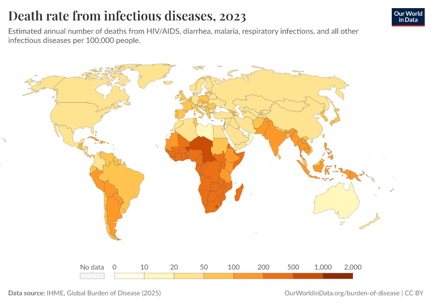 IHME, Global Burden of Disease (2025) – with major processing by Our World in Data. “Death rate from infectious diseases – IHME” [dataset]. IHME, Global Burden of Disease, “Global Burden of Disease - Deaths” [original data]. Retrieved April 11, 2026 from https://bespoke-viz-urb.owid.pages.dev:8789/20260323-161325/grapher/infectious-disease-death-rates-gbd.html (archived on March 23, 2026).
